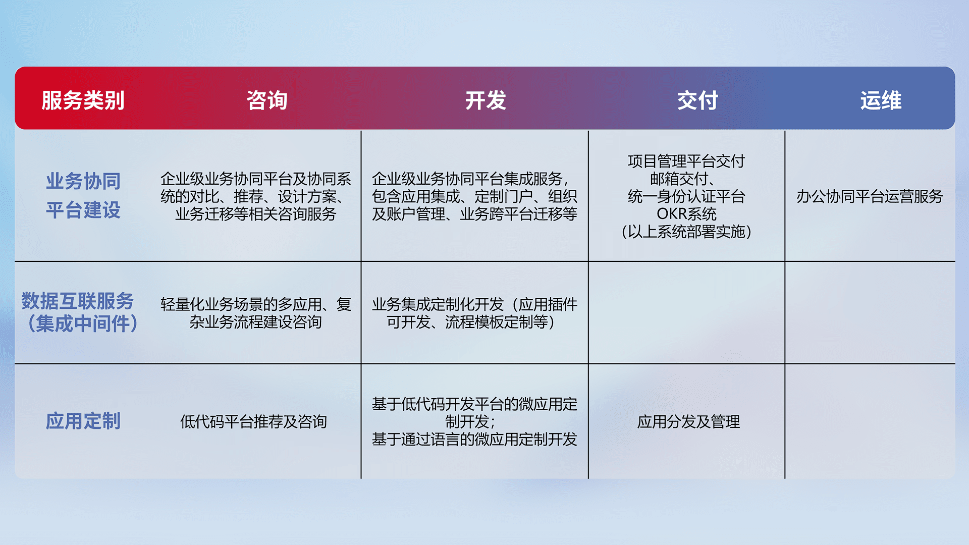 针对钉钉、、、企微、、IDaas等平台级产品提供产品的规划、、、方案、、交付、、定制化开发等服务,,,,实现如统一协同办公、、、智能客户服务、、、混合会议管理、、、智能数据查询、、、、等业务场景,,实现数字化转型。。。。