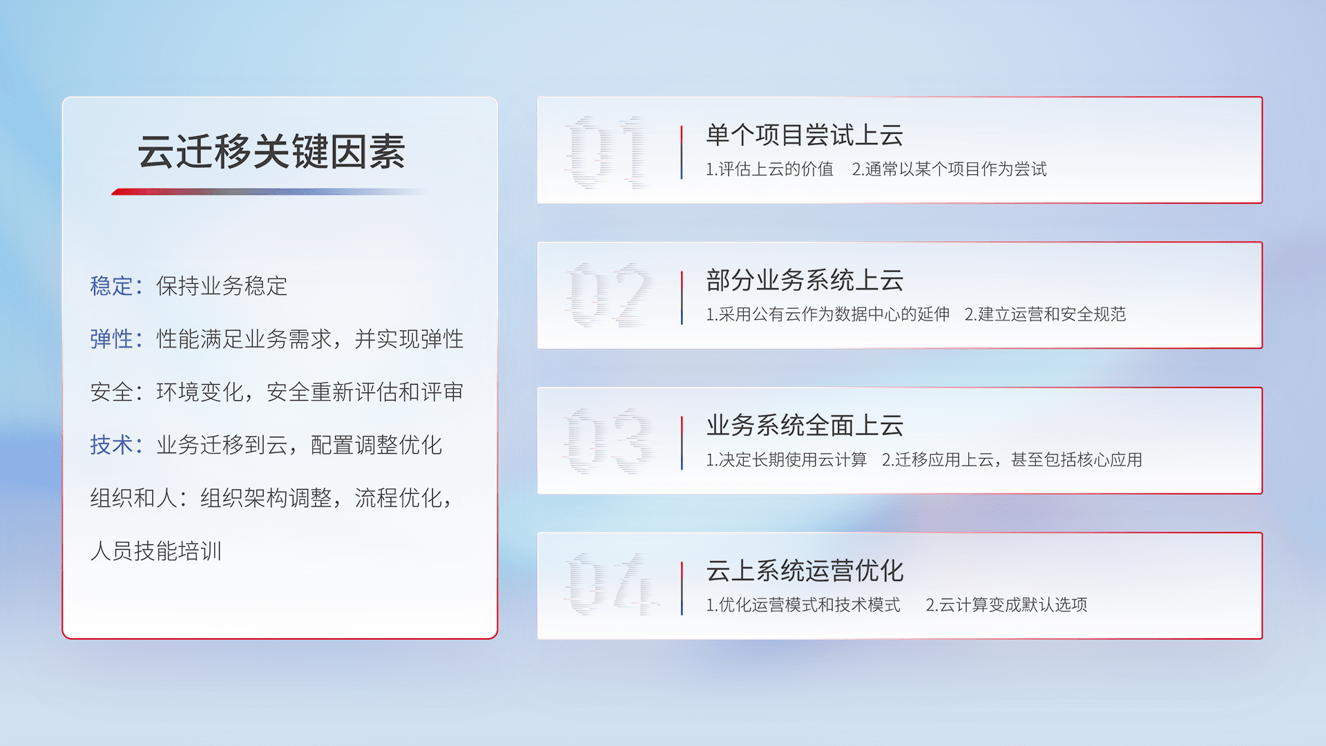 结合实际业务,,,,从规划设计、、、云平台选型、、、、云原生改造、、数据迁移、、、、集成交付,,,,迁移全过程为客户识别最佳上云路径,,做好风险识别管理,,设计网络架构、、身份权限、、、、安全审计合规、、、操作审计、、日志审计、、、、监控告警策略、、多站点容灾设计等,,,,对云上基础设施进行整体规划,,,,提升IT治理水平,,,,以满足弹性、、、、高可用、、高性能的需求。。。。