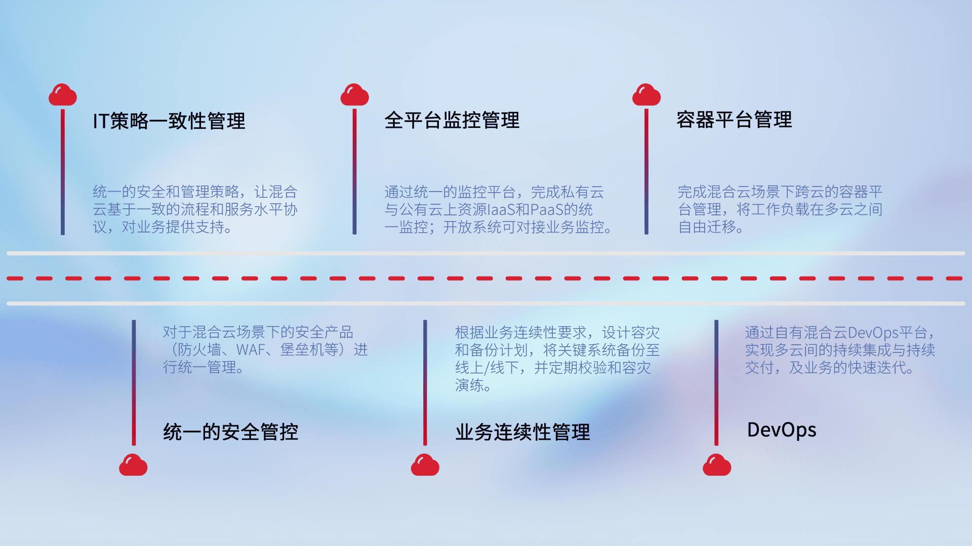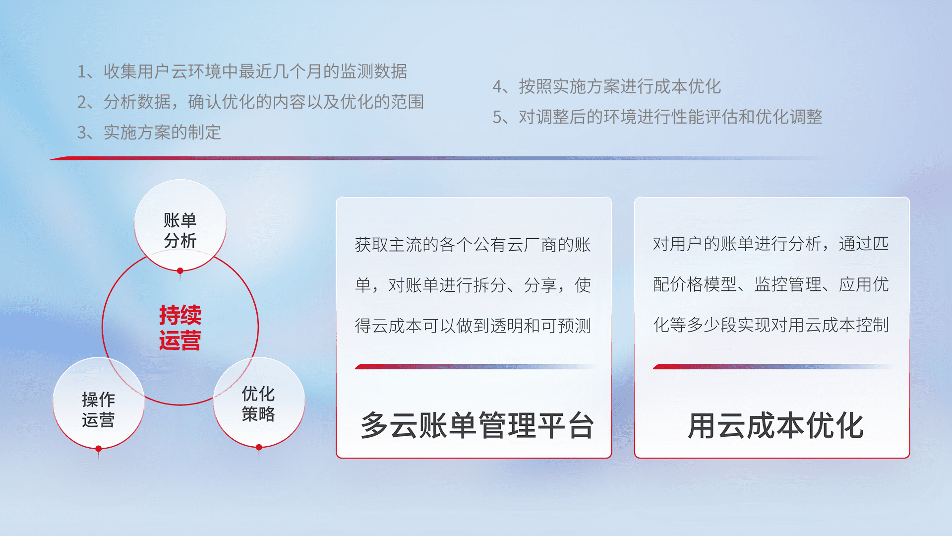 通过多云纳管,,,以统一的资源数据模型把客户的云资源进行抽象和封装,,进而实现对多云资源的统一操作,,,,保障云资源管理的可靠性、、、稳定性与可用性。。。量身定制化运维内容,,,,配置、、、开发运维、、、补丁管理、、、、备份、、监控、、、、认证和访问管理、、、审计和日常巡检等,,保障在用云过程中的可靠度,,,,稳定度以及高可用率。。