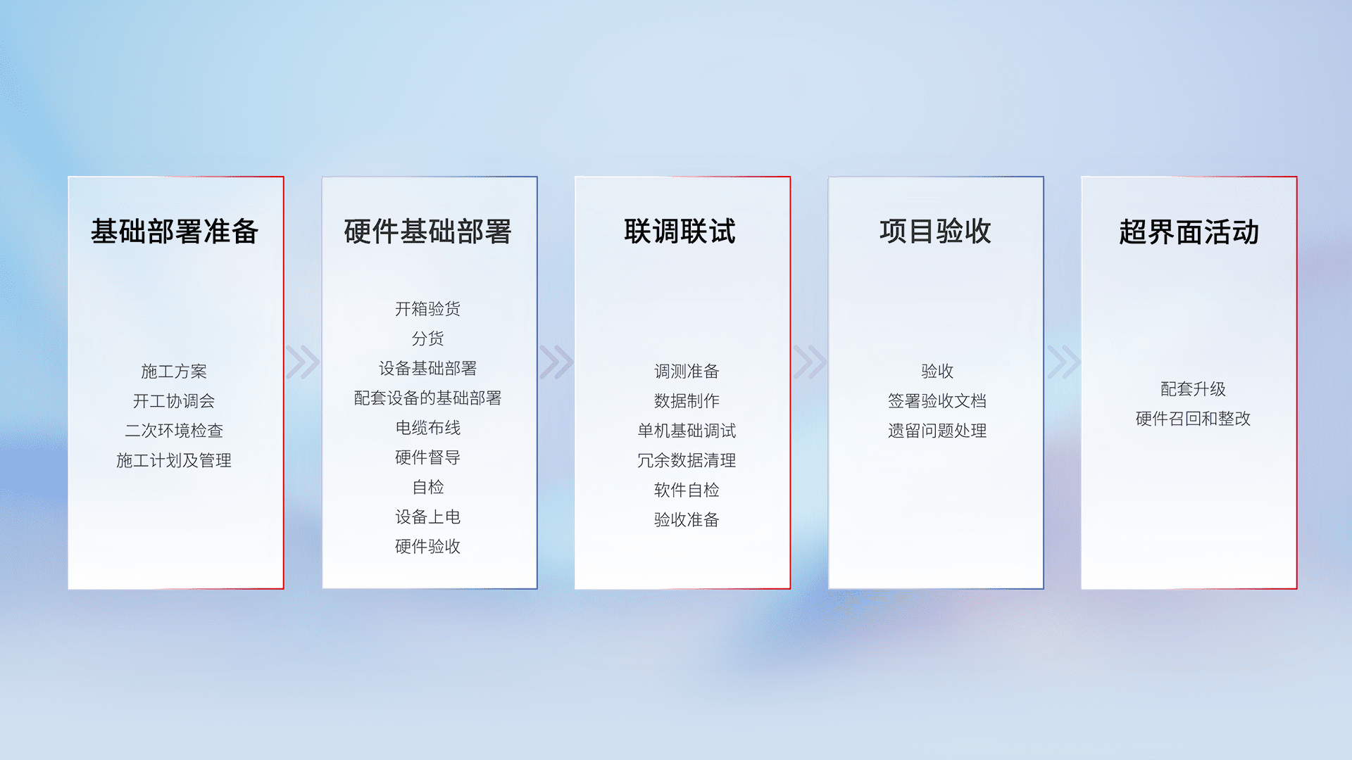 从基础部署准备、、、、硬件基础部署、、、联调联试、、项目验收、、越界面活动的全过程可追溯,,,保证施工质量和进度。。。。